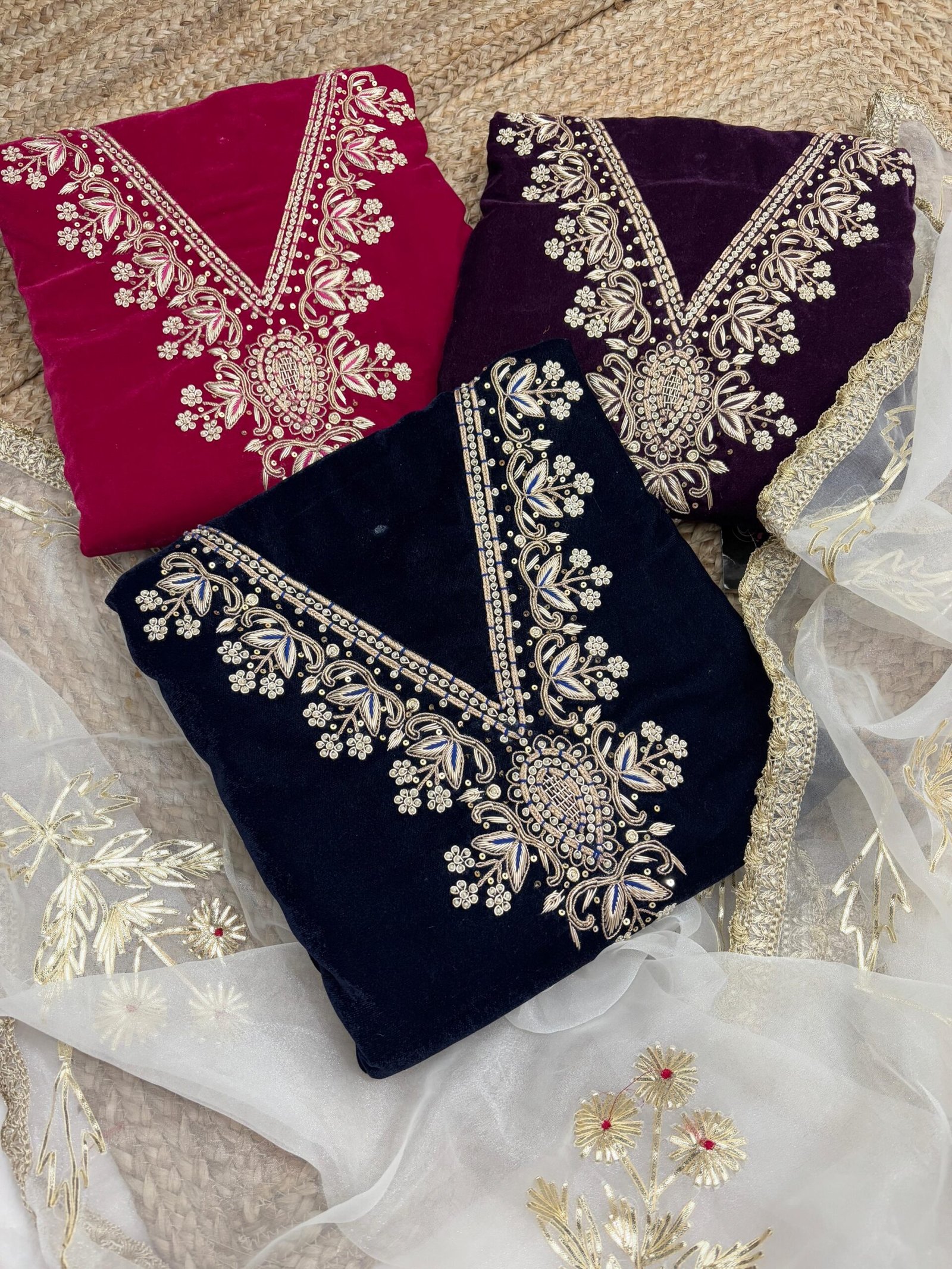 The Kurta (Top) comes in a generous 2.5-meter cut of soft velvet, showcasing intricate Handwork around the neckline for a touch of subtle sparkle and elegance. The Bottom is also a 2.5-meter piece of the same high-quality velvet, ensuring a perfectly matched and comfortable ensemble.